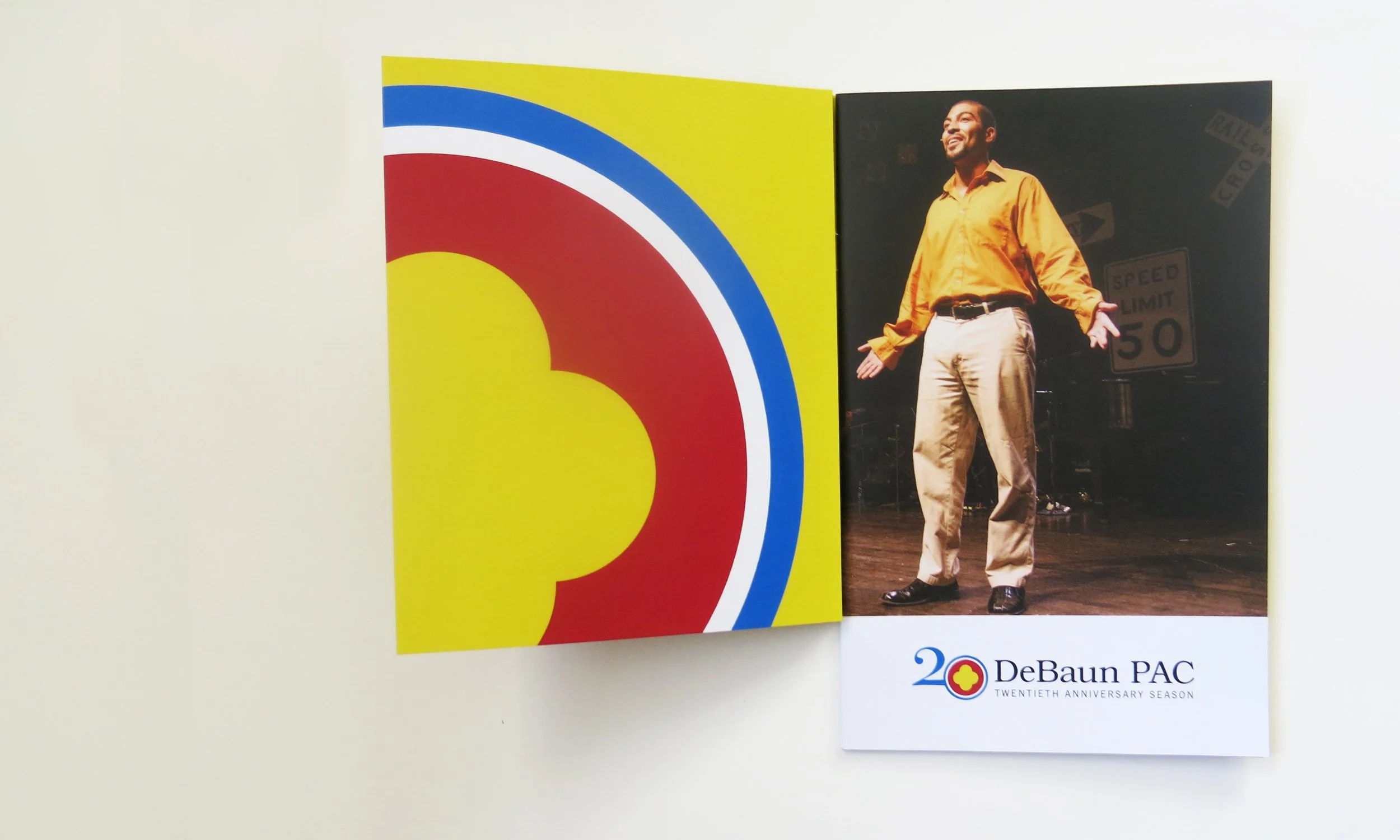 The season brochure and season program were redesigned from the previous seasons. A die-cut quatrefoil was used for the cover of the season brochure to peek in to a performance. On the season program, a large '20' bleeds off the cover and opens up to show a performer in mid act on stage.